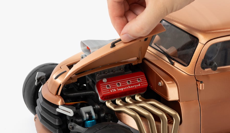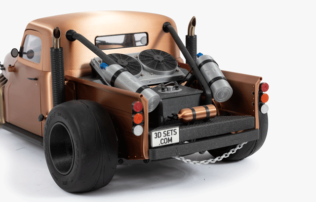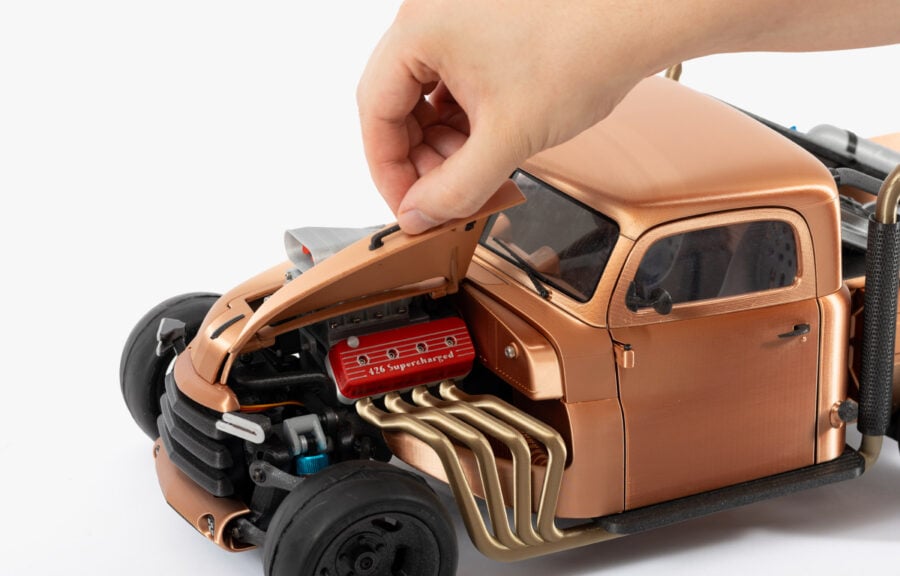 A real challenge for all lovers of fast driving, performance and individual car styling. This model is designed to fulfil your wildest drag racing dreams. The combination of the powerful V8 engine typical of hot rod cars, the large and wide rear wheels and the adjustable chassis make it an icon not only of car culture but also of 3D printing culture.