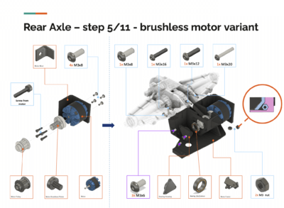 A: We recommend PLA for most parts of the model. We have the best experience with Fillamentum PLA or Prusament PLA premium printing materials. Most parts do not matter the filament quality, but some parts may be very sensitive – for example, the gearbox gears, motor pinion, and differential gears.