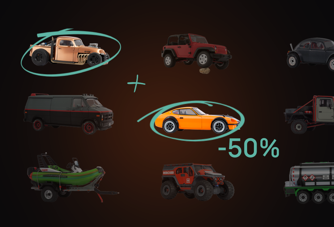 Choose any 2 models of our cars, boats or trucks and don’t forget to use coupon “BF2024” in your cart. You will automatically receive 50% off the price of the cheaper model.